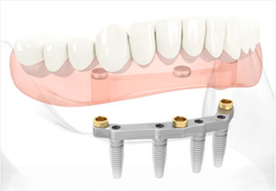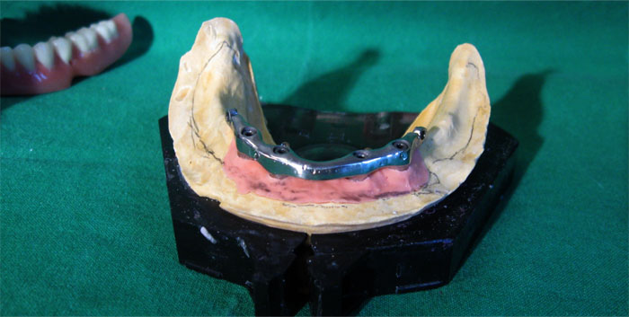 Die Zahnimplantate werden durch eine Metallstegkonstruktion miteinander verbunden. Nach dem gleichen Prinzip, wie bei auf natürlichen Zähnen befestigten Prothesen, klicken sich bei einem auf Implantaten befestigten Zahnersatz die Präzisionsaufsätze aus Teflon in den Steg ein.