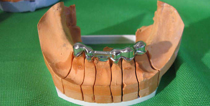 Der innere Teil der Stegprothese, welcher am Zahnfleisch anliegt, wird mit einem Metallgerüst und einer Präzisionsverbindung gefertigt (das gelbe Teil im Metallgerüst).
